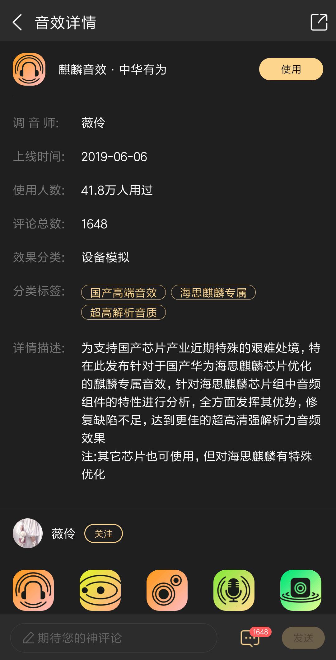 该音效的详情描述为:为支持国产芯片产业近期特殊的艰难处境,特在此发布针对国产华为海思麒麟芯片优化的麒麟专属音效,针对海思麒麟芯片组中音频组件的特性进行分析,全方面发挥其优势,修复缺陷不足,达到更佳的超高清强解析力音频效果。