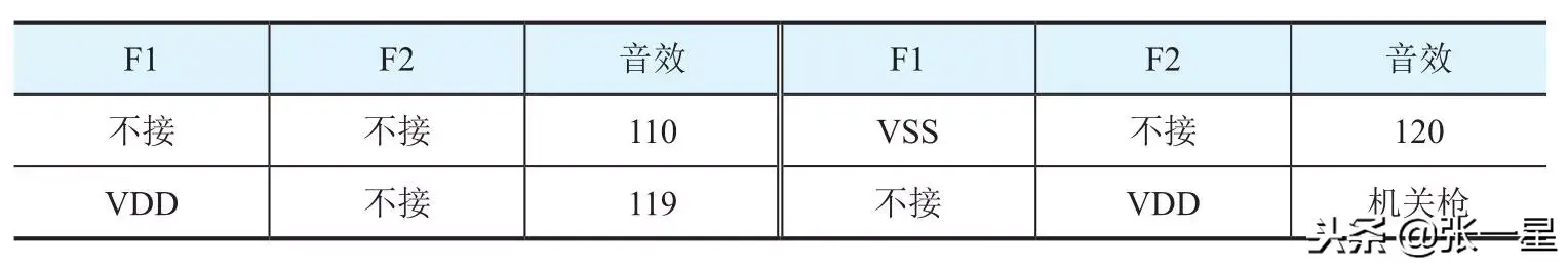 使用该芯片要注意,电源电压不能超过3.6V,振荡电阻取值范围100~240kΩ,阻值大小影响输出频率,经过多次试验,电源电压3V时,电阻为200kΩ,输出各种声音最逼真。最关键是选声端F1、F2如何接入,