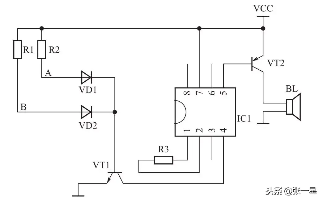 设计两路报警,图中A点与电源负极之间采用细导线(漆包线)围住需要保护的现场;同理B点与电源负极也采用细导线连接保护另一个现场。正常时候,二极管VD1、VD2阳极均接地,三极管VT1截止,音乐芯片失电而不能工作,扬声器BL也就不会发声。若不知情的不法分子进入设防区,任何一路细导线断开,三极管VT1都会导通,IC1得电工作,扬声器发出“110”报警声音。掌握本制作中信号采集方法,三极管VT1在此的用法。