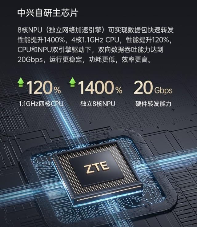 根据官方介绍,这款名为“坤鹏”的中兴自研十二核主芯片,由8核NPU(独立网络加速引擎)以及4核1.1GHz CPU组成,双向数据吞吐能力达到了惊人的20Gbps。中兴的高管更是在微博上称赞其“可能是东半球算力更强的信号更稳的旗舰级路由器芯片”。