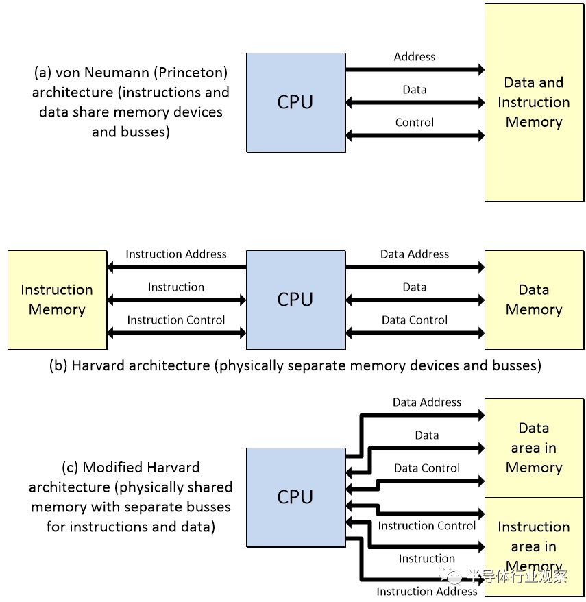 在冯·诺伊曼/普林斯顿体系结构中,数据和指令都存储在相同的物理存储空间中,并使用相同的地址、数据和控制总线进行访问。相比之下,在哈佛体系结构中,指令和数据存储在物理上不同的存储器件中,使用它们自己的总线进行访问。