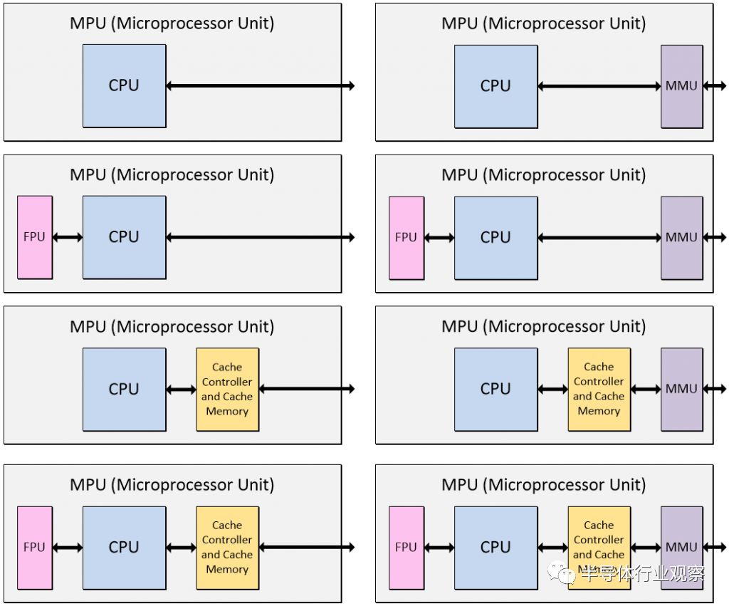 这些天,有成千上万的MPU产品。一些只包含一个单独的CPU,一些包含一个CPU以及缓存、FPU和内存保护或内存管理单元的各种组合,还有一些包含多个CPU、FPU等。(请注意,MPU可能包含额外功能——出于讨论的目的,我们将重点放在核心功能上。)