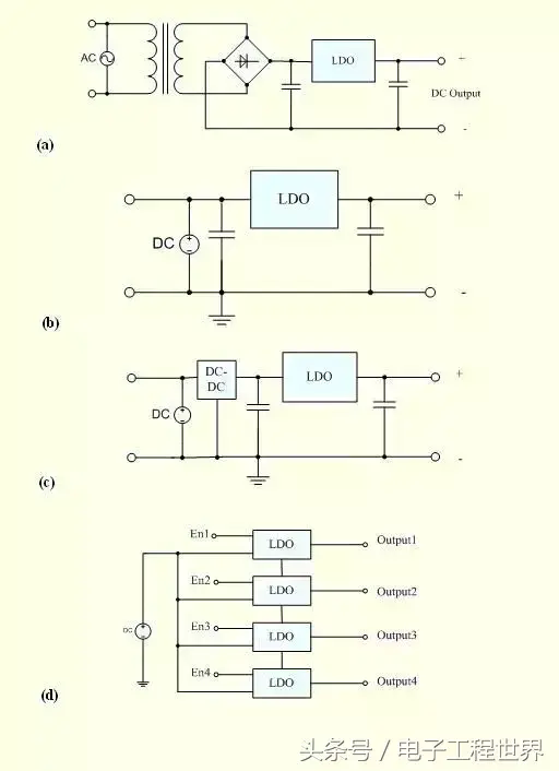 在某些应用中,比如无线电通信设备通常只有一足电池供电,但各部分电路常常采用互相隔离的不同电压,因此必须由多只稳压器供电。为了节省共电池的电量,通常设备不工作时,都希望低压差线性稳压器工作于睡眠状态。为此,要求线性稳压器具有使能控制端。有单组蓄电池供电的多路输出且具有通断控制功能的供电系统如图3-1(d)所示。