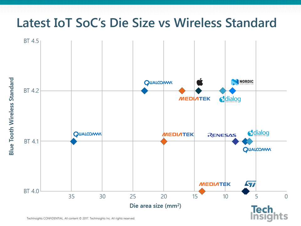 最新的IoT SoC裸晶尺寸与无线标准比较(来源:TechInsights.com)