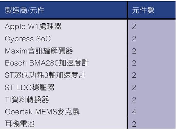每一台Airpods的设计和芯片数都是一样的。在两个耳塞内部的主要IC组件及其数量如表1所示: