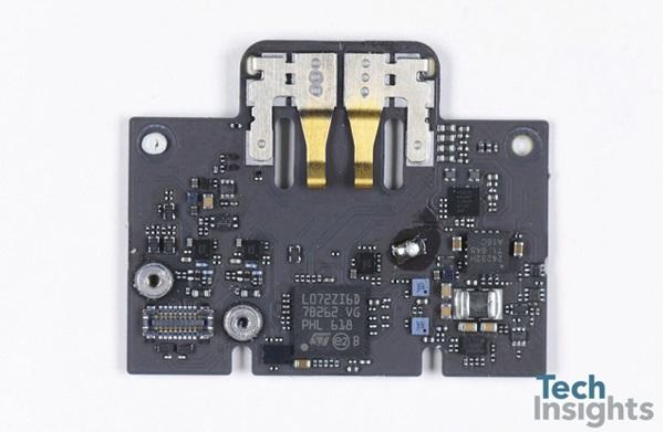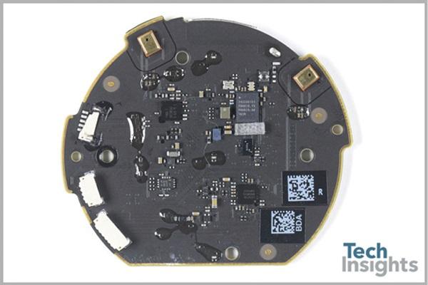 而在双面PCB,我们在其中一面发现了一款Maxim音频编译码器、一款Bosch BMA280加速度计。而在另一面,我们发现了意法半导体的超低功耗3轴加速度计、意法半导体LDO稳压器,还有一款无法辨识的光传感器与一些被动组件。