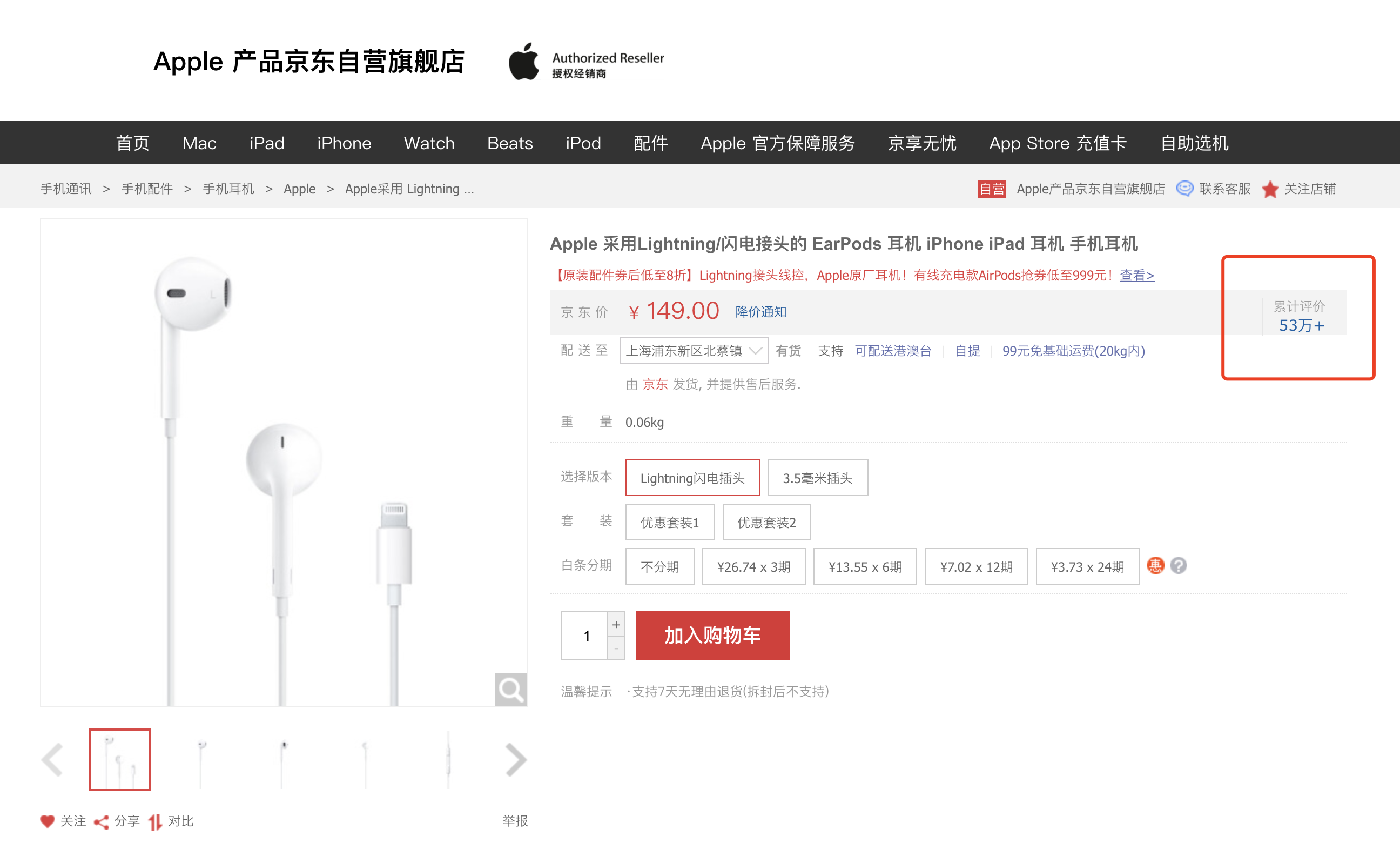 你很难想象一款售价399元的无线耳机能做到和iPhone的无缝结合。之前苹果曾在官网发售的原装有线耳机EarPods还售价149元,更夸张的是,在苹果京东自营旗舰店,这款耳机的累计评价超过了53万。