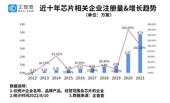 企查查数据显示,中国现存芯片相关企业14.29万家。2022年上半年,中国新增芯片相关企业3.08万家,近10年来,中国芯片相关企业注册量不断大幅增加,芯片产业正迅猛发展。