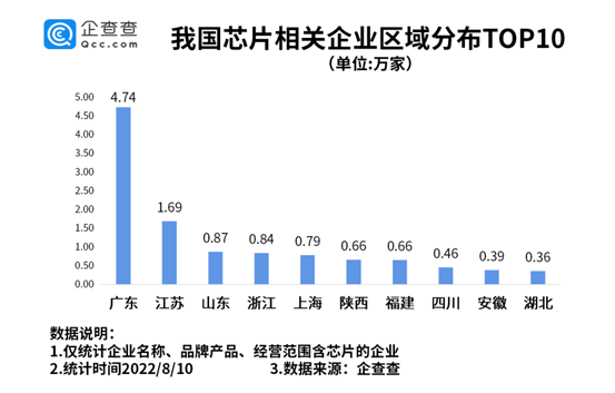 从区域分布来看,广东以4.74万家芯片相关企业排名第一。江苏、山东分别有1.69万家、0.87万家芯片相关企业,位居前三。此后为浙江、四川等。