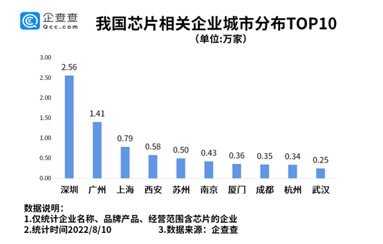 从城市分布来看,深圳以2.56万家芯片相关企业排名第一。广州、上海分别有芯片相关企业1.41万家、0.79万家,排名前三。成都位居第八位。