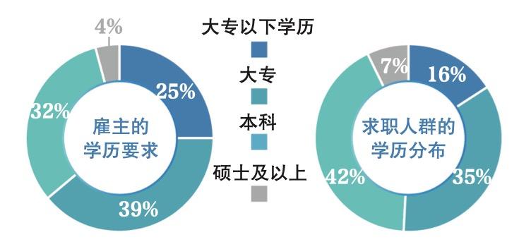 市场供需报告显示,从学历上看,雇主对学历的要求及求职人群的学历主要以大专及本科为主,占比在80%左右。