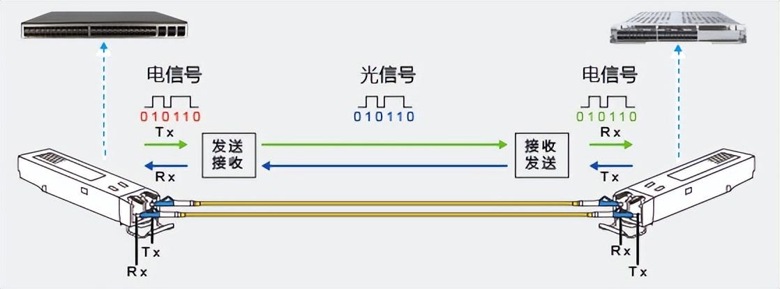 光模块的的发送端把电信号转换成光信号,通过光纤传送后,接收端再把光信号转换成电信号,完成信息传递。