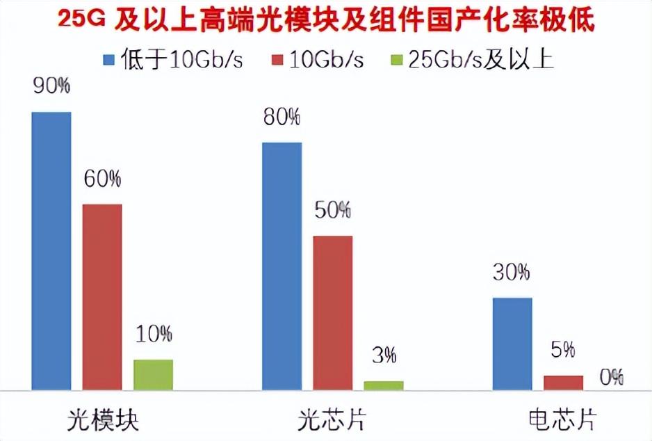 当前,国内厂商仅能对中低端光芯片实现国产化,如 2.5G 和 10G 光芯片,已经广泛运用于移动通信和数据中心市场。