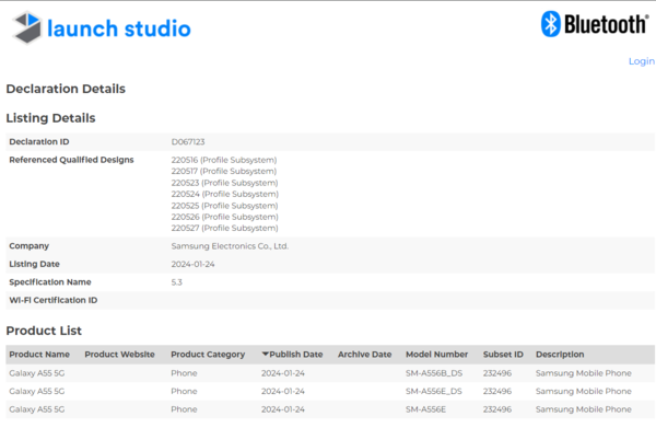 【手机中国新闻】1月24日晚,据外媒报道,三星中端新机A55 5G即将上市,该机型已经通过了多个认证平台的审核。最新的消息显示,该机型已经获得了蓝牙SIG认证。