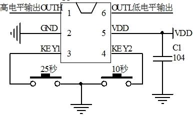 上电不工作,OUTH为低电平,OUTL为高电平,短按按键开始计时OUTH输出高电平、OUTL输出低电平,计时结束电平信号翻转。中途触发停止计时输出信号翻转。