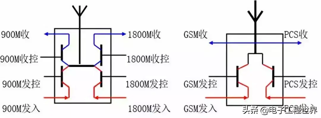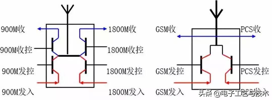 逻辑电路根据手机工作状态分别送出控制信号(GSM-RX-EN;DCS- RX-EN;GSM-TX-EN;DCS- TX-EN),令各自通路导通,使接收和发射信号各走其道,互不干扰。