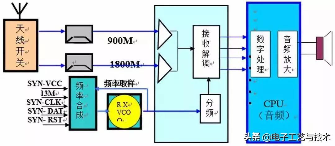 接收电路由天线、天线开关、滤波器、高放管(低噪声放大器)、中频集成块(接收解调器)等电路组成。早期手机有一级、二级混频电路,其目的把接收频率降低后再解调(如下图)。