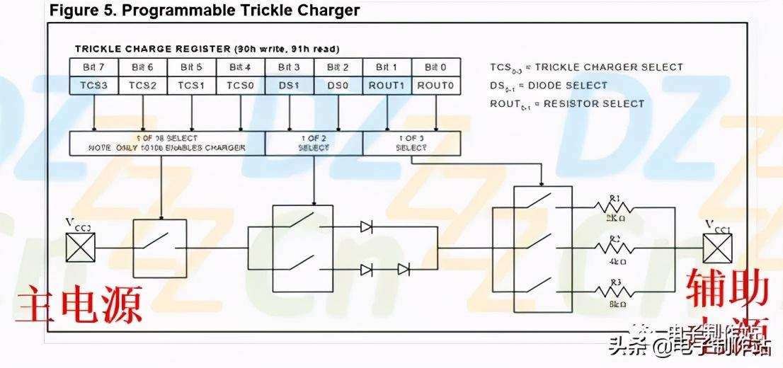 如果电池是可充电型的,当VCC2主电源有供电时,我们就可以使用充电寄存器来控制充电参数,我们来看看VCC2与VCC1之间的内部电路,如下图所示: