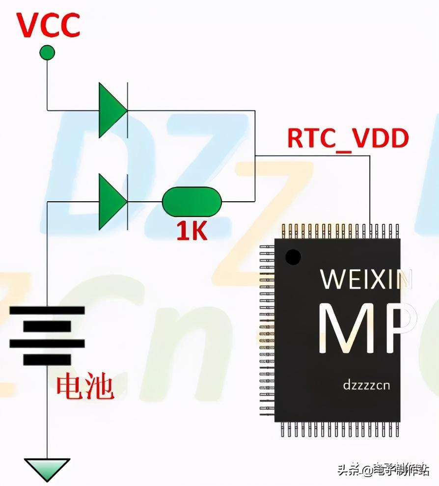 图中RTC_VDD是RTC单元的供电电源,电路系统上电后VCC是有电的,同时也给RTC单元供电,断电后则由电池供电,两个二极管可以防止VCC与电池之间出现漏电状态。
