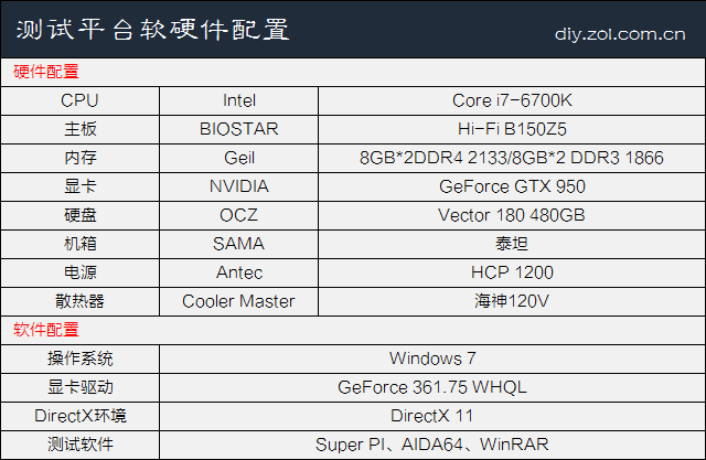 为了避免CPU产生瓶颈,测试选择了Skylake旗舰Core i7-6700K,搭配的显卡为GeForce GTX 950,拥有768个CUDA核心,核心频率为1165MHz,Boost加速频率为1355MHz,显存频率为6600MHz。