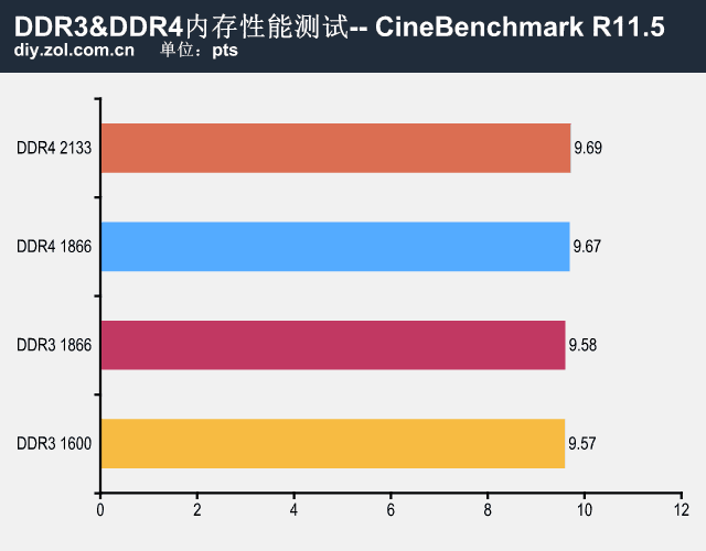 CineBenchmark主要测试CPU的多核运算性能,DDR3 1600和DDR3 1866两组频率全面落败,成绩分别为9.57pts和9.58pts,而DDR4 1866和DDR4 2133内存组成绩分别为9.67pts和9.69pts,与CPU计算性能而言,看似更优的DDR3 1866确没有胜过DDR4 1866,成绩却低出了不少,看来Skylake DDR4内存的优化已经非常到位 。