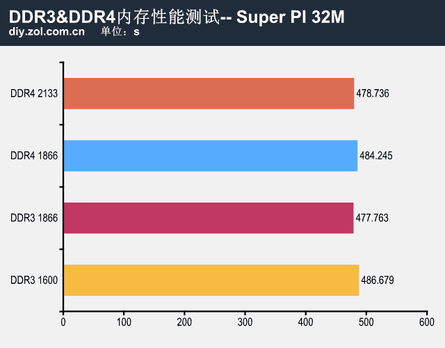 Super PI 32M测试,成绩最高的为DDR3 1866,耗时为7m57.763s;紧随其后的为DDR4 2133,耗时7m58.736s,而DDR3 1600和DDR4 1866耗时都在8m开外。