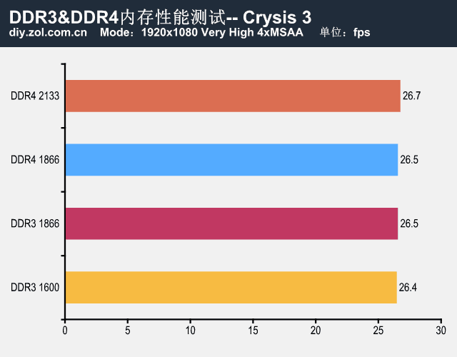 首先进行的《Crysis 3》测试,DDR4 2133平均帧率最高为26.7fps,而DDR3 1866和DDR4 2133均为26.5fps,DDR3 1600则为26.4fps。
