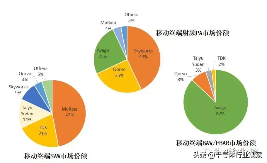 目前滤波器分为高性能BAW/FBAR和SAW,传统的SAW市场已趋于饱和,大部分市场被MuRata、TDK、太阳诱电占据;作为升级替代产品的BAW滤波器市场也被Avago和Qorvo两家公司瓜分。射频PA市场也是寡头分占的局面,可以说留给其他射频厂商的机会少之又少。