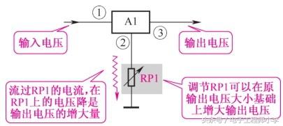 当RP1的阻值调到为0Ω时,就是典型的三端稳压电路;当RP1阻值增大时,这一电路的输出电压增大。