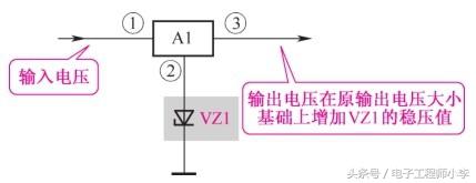 VZ1是稳压二极管,集成电路A1②脚输出的电压使VZ1导通,这样②脚对地之间的电压就是VZ1的稳压值,所以这一稳压电路的输出电压大小就是在A1输出电压值基础上加VZ1的稳压值。