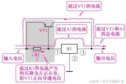 流过R1的电流在R1两端产生压降,其极性为左正右负,压降加到VT1基极与发射极之间,是正向偏置电压,VT1导通,一部分负载电流通过VT1发射极、集电极供给负载。