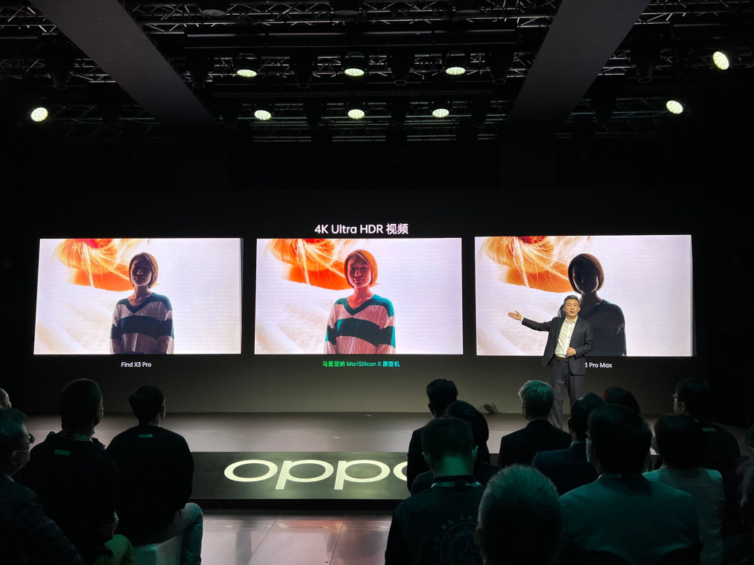 现场,OPPO 展示了一段 MariSilicon X 芯片原型机的 4K 夜景视频,画面亮度和色彩表现明显优于 Find X3 Pro 和 iPhone 13 Pro Max。