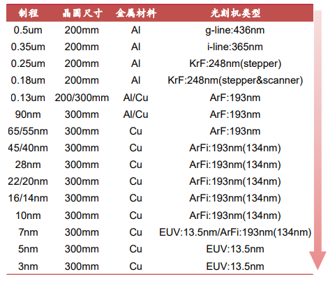 光刻过程的光波长已经经历了G线(432nm)、I线(365nm)、KrF(248nm)以及ArF(193nm)的深紫外波段的发展历程,目前13.5nm波长的极紫外光刻机(EUV) 已经投入使用。