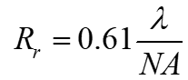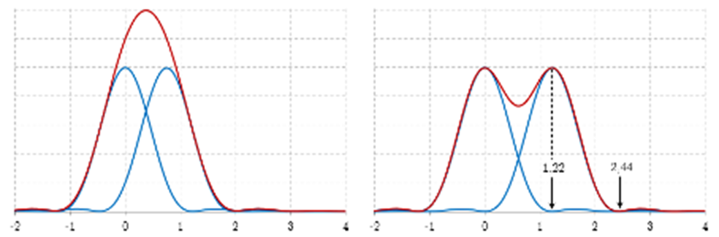 该分辨率表达式描述了两个光斑时恰好能分辨的极限位置 ——当一个光斑的极大位置与另一个光斑的第一个零值点重合。其中,λ为照明光波长。