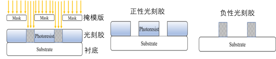 光刻胶是光刻成像的主要承载介质 ,分为正胶和负胶,曝光区域更容易在显影液中溶解 的为正性光刻胶,曝光区域更不易在显影液中溶解的是负性光刻胶。