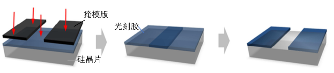 我们希望通过光学曝光将图纸上设计好的电路图案转移到硅晶圆上 ,但是光不能对硅材料产生影响,所以需要借助一个中间材料,也就是能直接和光相互作用的光刻胶 。