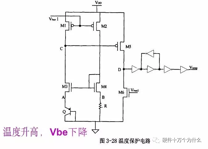 3、过温保护模块 OTP温度保护是为了防止芯片异常高温损坏,原理比较简单,利用晶体管的温度特性然后通过比较器设置保护点来关断输出。