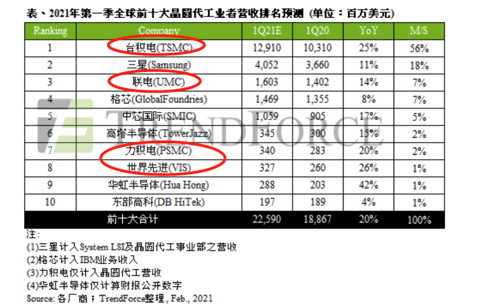 按照TrendForce的数据,2021年,在晶圆代工,也就是Foundry领域,台湾省拿下了全球64%的份额,排名全球第一。