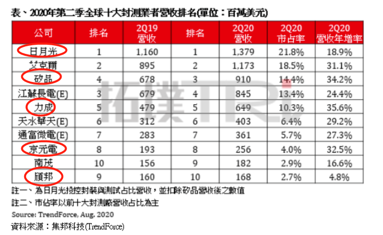 而芯片制造、设计的发展,又带动了封测的发展,于是日月光、矽品、力成、京元电、欣邦这些台湾本土的封测企业也发展起来了。