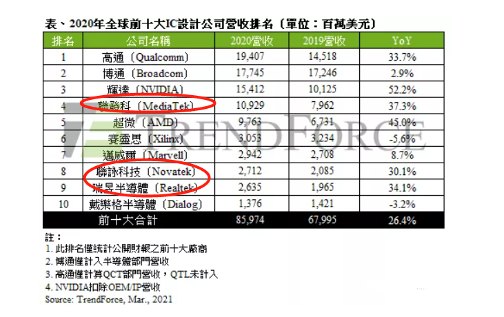 而说起IC设计方面,全球前10大IC设计企业中,台湾也有三家,分别是联发科、瑞昱、联咏这三大厂商,分别排名第4、7、8名。