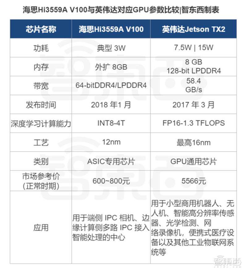 英伟达的产品对外报价动辄几千元,而对应海思的几百元,却能实现更低功耗、更高性能,主要因为华为选择了有别于GPU的,更适合安防领域的专用芯片路线。