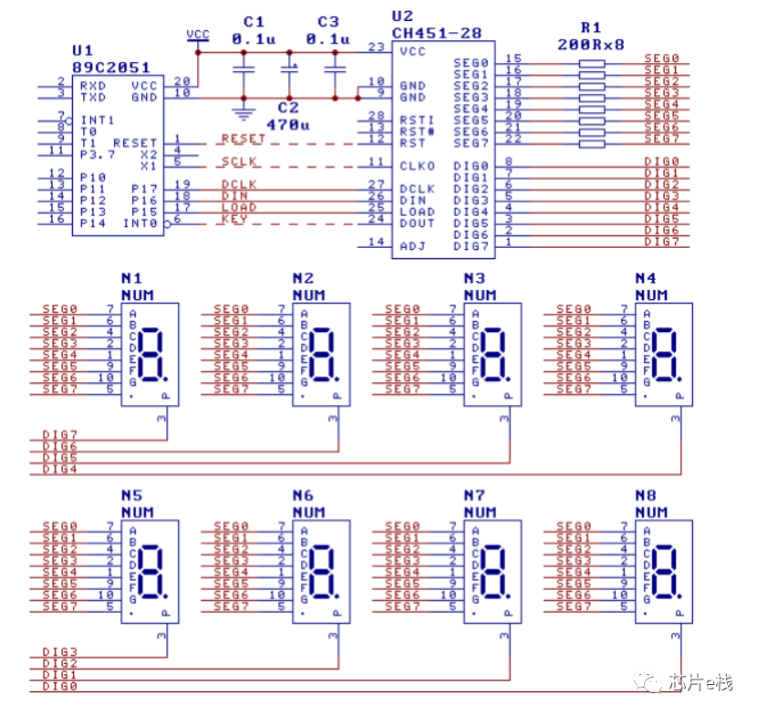 通过数码管驱动芯片CH451的方式,来做数码管的电路搭建。