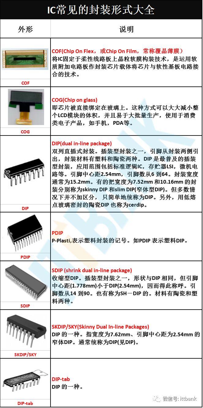 封装就是指把硅片上的电路引脚用导线引到外部引脚处,以便与其他元器件连接。封装形式是指安装半导体集成电路(IC)芯片用的外壳形式。集成电路常见的封装形式见下图: