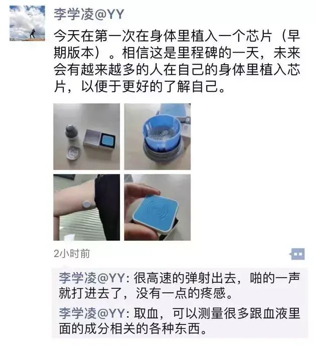 YY 创始人李学凌,自曝在手臂上植入了一个芯片。最终真相大白,这仅仅是身体指标的监测器 ,但确实引起了机哥对芯片植入的兴趣。